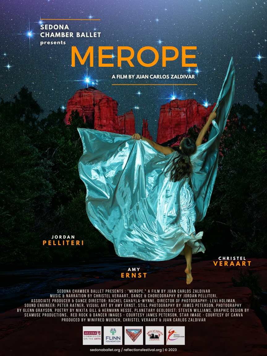 In this original anthropomorphization of Merope, the producers use the film medium itself to create the first iteration of Sedona Ballet’s Reflections Festival, inviting many artists across several arts disciplines —Photography, Music, Spoken Word and Visual Arts—to donate or create works inspired by Merope in one of the most beautiful places – Sedona. All works were then orchestrated under the direction of filmmaker and visual artist, Juan Carlos Zaldivar, underscored by Christel Veraart’s mesmerizing musical composition from a longer musical composition entitled “The Pleiades”.